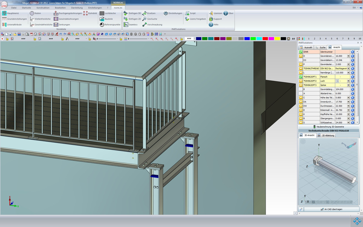 Ob Vordächer, Vorstellbalkone oder Türen / Tore in Stahl, Aluminium und Edelstahl: Noch nie war 3D-Konstruieren so einfach. Mit MegaCAD Metall 3D haben Sie genau die Tools, die Sie in der Praxis brauchen. In dieser Schulung werden Ihnen die Tools und deren Anwendung anschaulich vermittelt, sodass Sie im Anschluss in der Lage sein werden, 3D-Modelle und Metallbau-Konstruktionen anzufertigen, sowie fertigungsgerechte Konstruktions-unterlagen und Werkstattzeichnungen mit MegaCAD Metall 3D zu erstellen.