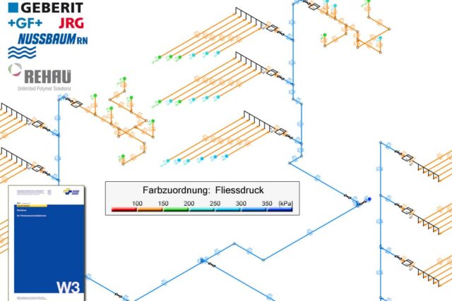Interaktive Rohrweitenbestimmung nach W3 2013 – auf dem neuesten Stand. CAD-Triwa ist darauf ausgelegt, Rohrleitungen in kurzer Zeit gemäss den Richtlinien W3 2013 des SVGW zu berechnen. Die berechnungsrelevanten Daten wie Fliessdruck, Geschwindigkeiten etc. werden vom Programm simuliert und in Echtzeit farblich dargestellt.