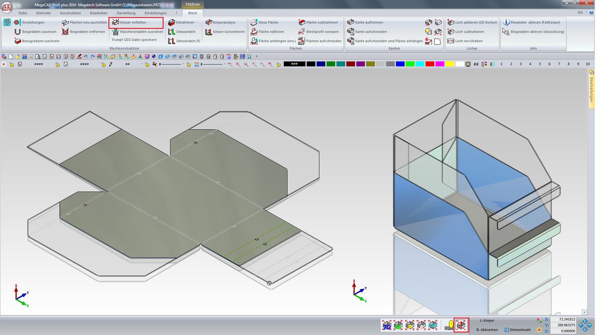 In MegaCAD Blech 3D lassen sich Faltkörper per Mausklick automatisch abwickeln. Das Ergebnis steht innerhalb von Sekunden als 2D-Kontur mit allen Biegelinien sowie den notwendigen Ausklinkungen am Bildschirm zur Verfügung und kann wie eine 2D-Zeichnung weiterbearbeitet werden.