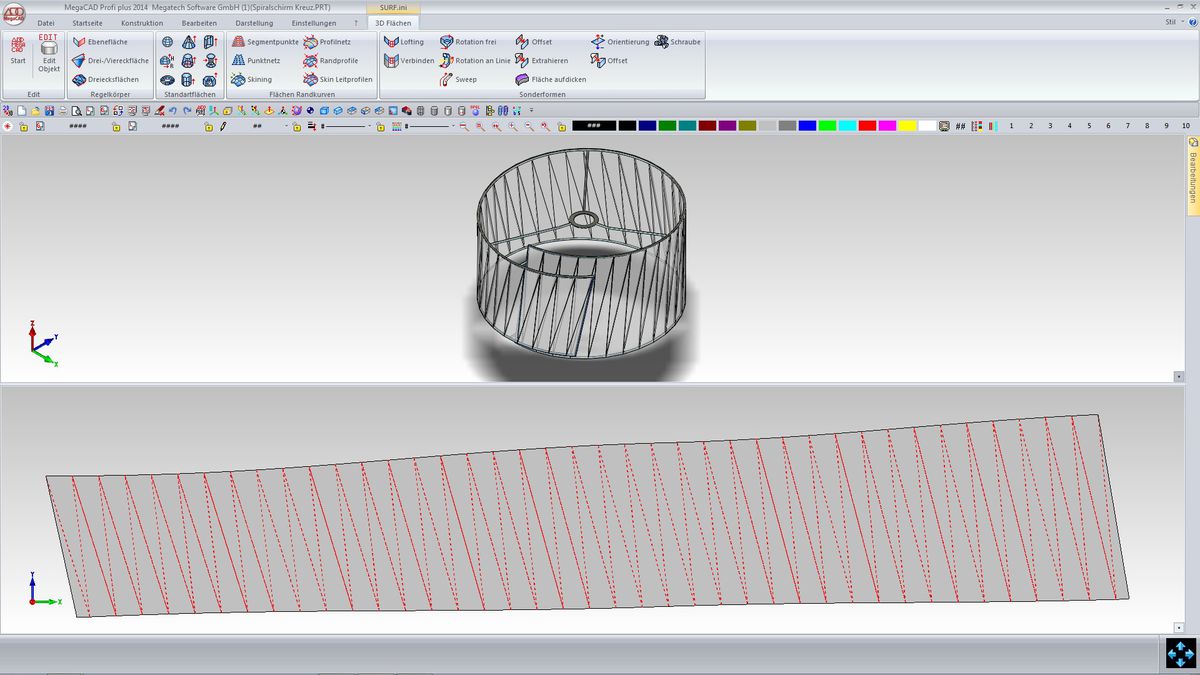 Manche Konstrukteure starten in 2D und „dicken“ (bzw. „pumpen“) die Flächen zu Körpern auf. Andere Designer arbeiten gleich in 3D und entwickeln erst in einem weiteren Schritt einen Faltkörper. Den Nutzern von MegaCAD stehen beide Wege und eine Vielzahl weiterer Möglichkeiten offen.