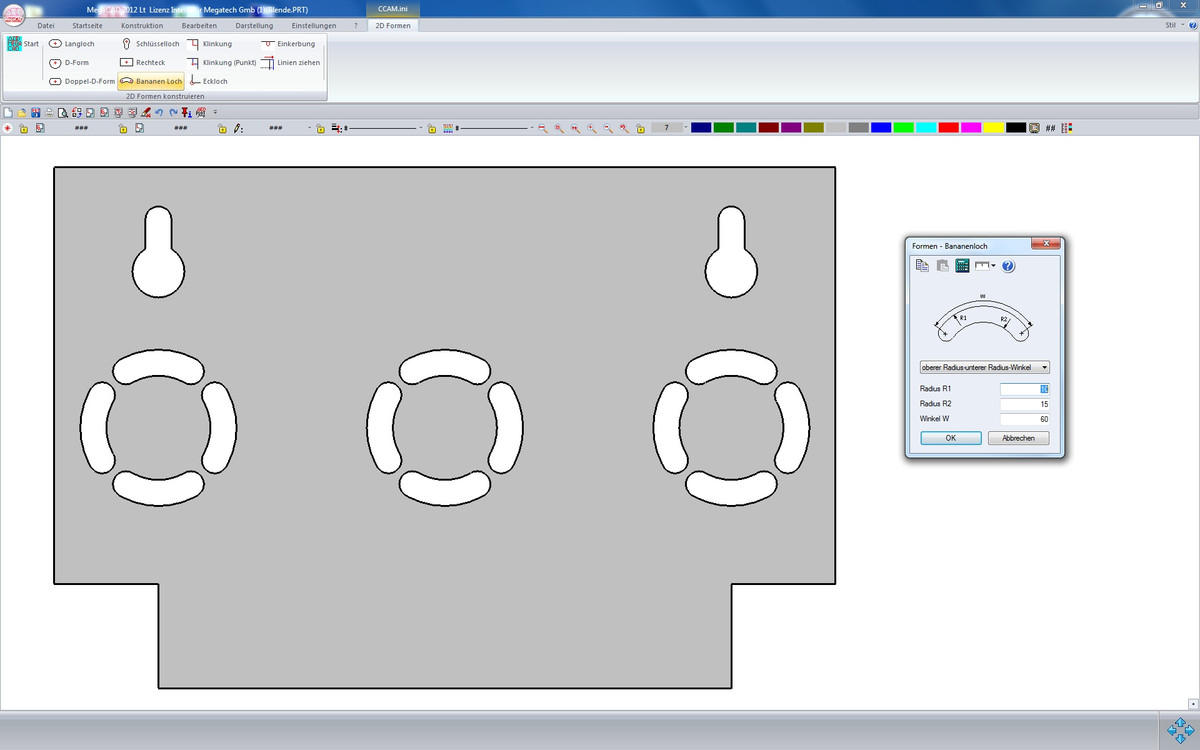 - Vordefinierte Formen erleichtern die Zeichnungserstellung (Rechteck, Langloch, Schlüsselloch, Bananenloch)