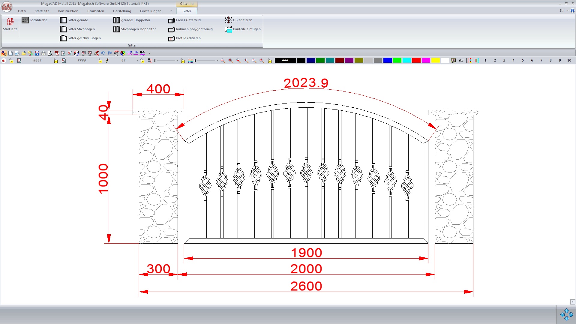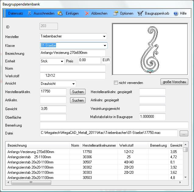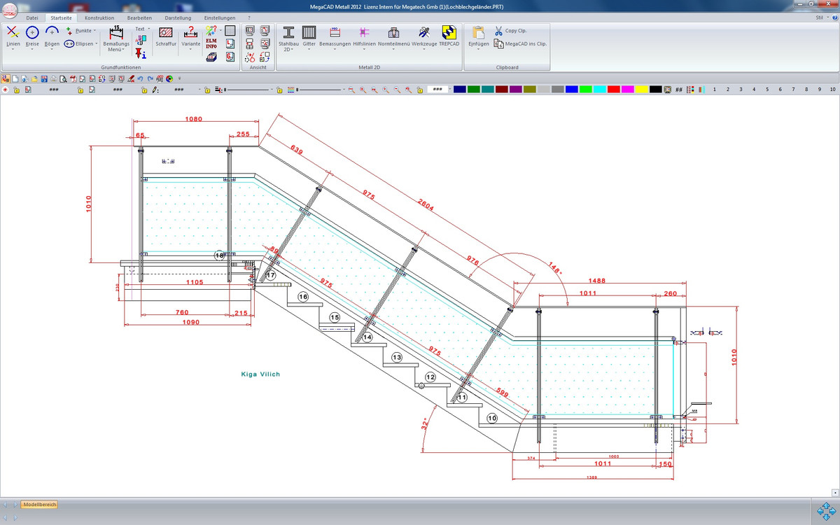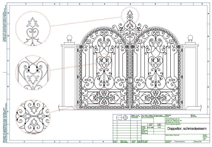 MegaCAD Metall ist die CAD-Software speziell für das Metallhandwerk. Sie zeichnen so selbstverständlich wie am Zeichenbrett. Dazu stehen Ihnen eine ganze Reihe äußerst nützlicher Arbeitshilfen zur Verfügung. Korrekturen sind schnell gemacht, einmal Gezeichnetes lässt sich immer wieder verwenden. Vordefinierte Schmuckelemente lassen sich problemlos einfügen, spiegeln, drehen und kopieren. Sehr praktisch ist der Gittergenerator: Er verteilt automatisch die Stäbe für z. B. Tore, Zäune oder Geländer. Automatisch können Sie auch Stück-, Pack-, Bestell- und Zuschnittlisten erstellen.