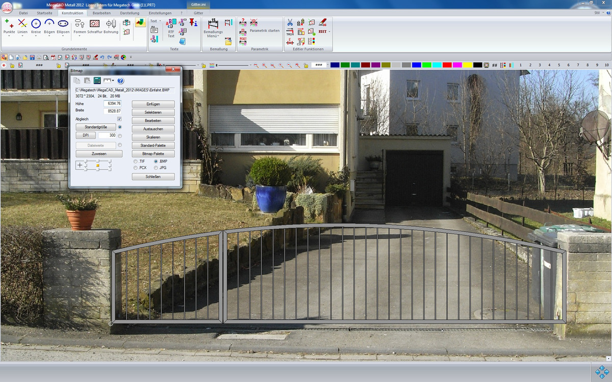 Fügen Sie ein beliebiges Bild (BMP, JPEG, PNG oder TIFF) maßstabsgetreu in eine MegaCAD-Zeichnung ein. Ebenso kann die gesamte Zeichnung als Bild in den genannten Formaten gespeichert werden.