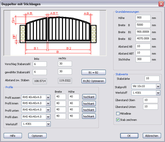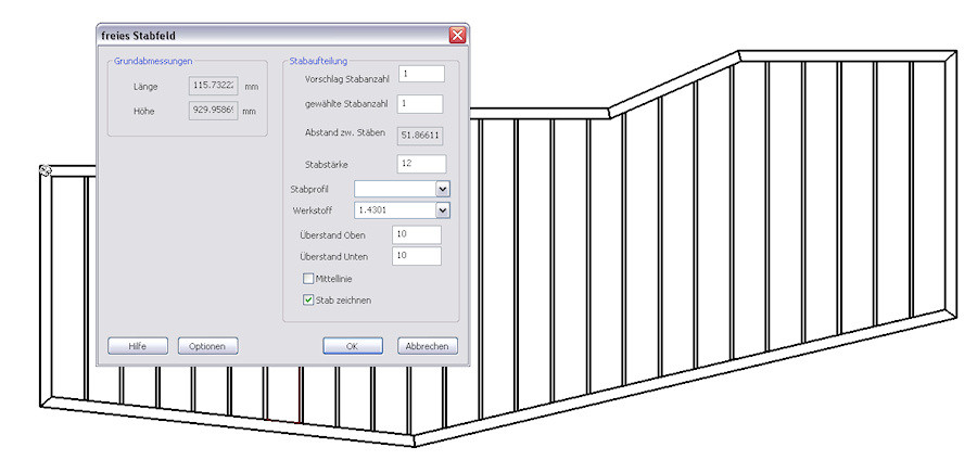 Gerade Rahmen, Rundbögen und Stichbögen mit Angabe der Rahmenstärke und Stabstärke werden automatisch generiert und die Stabaufteilung automatisch berechnet. Freie Rahmenformen für Treppengeländer, Zäune, Balkongeländer etc. stehen zur Wahl.