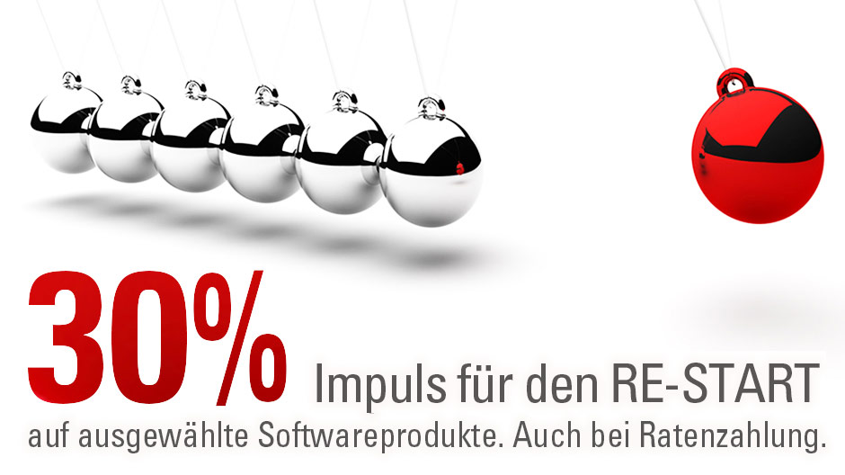 Viele von uns mussten in den letzten Wochen mit ungewöhnlichen Umständen umgehen und arbeiten nun wieder verstärkt am Aufschwung. Um Ihnen und uns den RE-START zu erleichtern senken wir ab sofort unsere Preise für ausgewählte Softwareprodukte um 30%*!