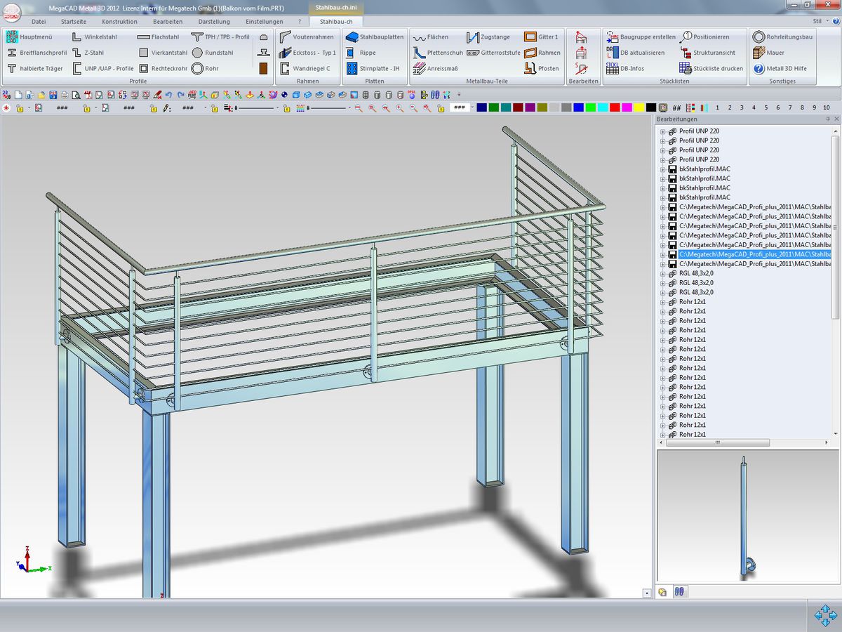 Hinzu kommt MegaCAD Metall 3D − die 3D-Software für das Metall- und Schlosserhandwerk. Die Bedienung des Programms ist sehr komfortabel. 2D-Zeichnungen werden mit wenigen Klicks in 3D-Modelle überführt und visualisiert. Auch eine 3D-Direkteingabe ist möglich. Regelkörper wie Quader, Zylinder und Pyramiden können dabei direkt, d. h. auch ohne 2D-Skizze erstellt und per Mausklick modifiziert werden. Von der gesamten Konstruktion lassen sich mit wenigen Klicks Zusammenbauzeichnungen, Fertigungszeichnungen und eine 3D-Visualisierung erzeugen und ausdrucken.