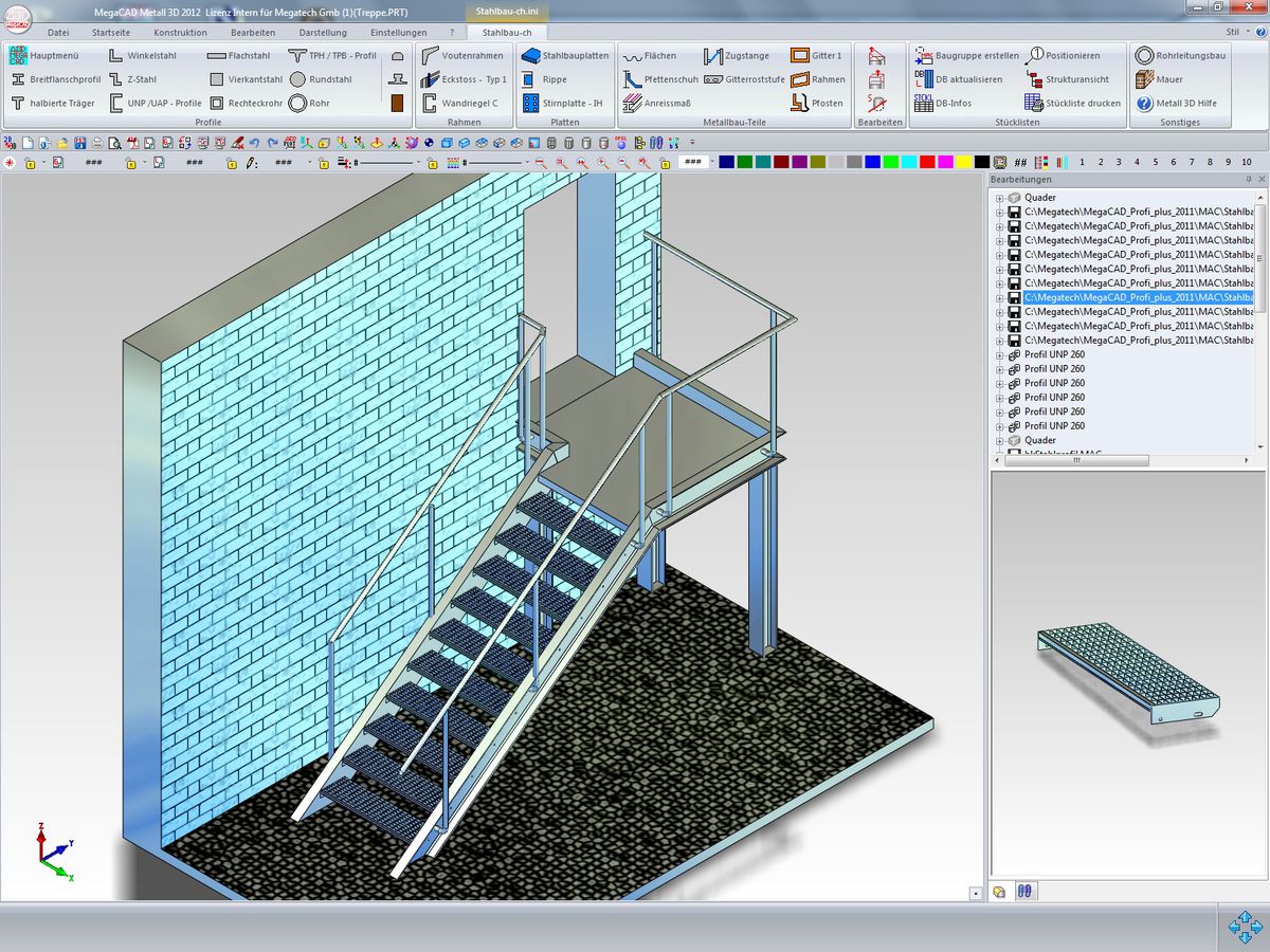 Hinzu kommt MegaCAD Metall 3D − die 3D-Software für das Metall- und Schlosserhandwerk. Die Bedienung des Programms ist sehr komfortabel. 2D-Zeichnungen werden mit wenigen Klicks in 3D-Modelle überführt und visualisiert. Auch eine 3D-Direkteingabe ist möglich. Regelkörper wie Quader, Zylinder und Pyramiden können dabei direkt, d. h. auch ohne 2D-Skizze erstellt und per Mausklick modifiziert werden. Von der gesamten Konstruktion lassen sich mit wenigen Klicks Zusammenbauzeichnungen, Fertigungszeichnungen und eine 3D-Visualisierung erzeugen und ausdrucken.
