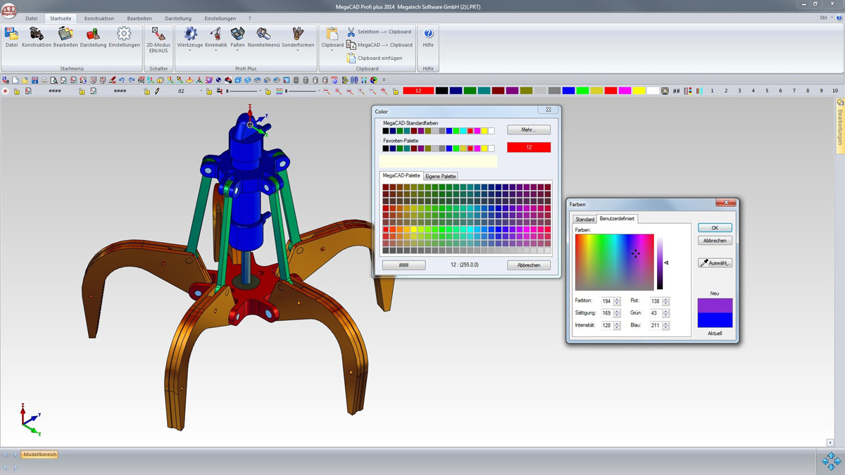 Die Überarbeitung der neuen Version wird dem Anwender gleich beim Öffnen vor Augen geführt. Denn das neue Startmenü von MegaCAD 2014 fasst alle Hauptfunktionen übersichtlich zusammen. So gelangt man schnell und auf direktem Wege in die gewünschten Untermenüs. Der Umstieg auf True Color macht es außerdem möglich, die Modelle nach Belieben zu kolorieren. 16,7 Mio. Farben stehen hierfür zur Verfügung.