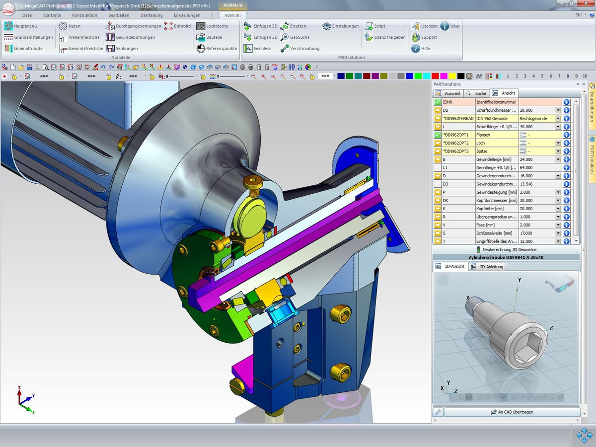 MegaCAD Profi plus verbindet einen 3D-Modellierer und ein vollwertiges 2D-Zeichenwerkzeug unter einer Oberfläche. In die Software integriert sind eine komplette Normteil- und Normaliensuite (CADENAS PARTsolutions Professional), technische Berechnungen und zahlreiche Funktionen zur Detaillierung von Zeichnungen. Zusätzlich enthält das Hochleistungsprogramm den kompletten Umfang von MegaCAD USF (Blechpaket), Kinematik und alle wichtigen Schnittstellen. Dank des Kinematik-Moduls entsteht mit wenigen Mausklicks ein Eindruck davon, wie sich das fertige Produkt in Aktion verhält. Sämtliche Programmfunktionen sind optimal aufeinander abgestimmt. Dadurch werden die Investitionen in die Konfiguration, Implementierung und Verwaltung der Software deutlich verringert, die Arbeitsprozesse gleichzeitig spürbar beschleunigt.