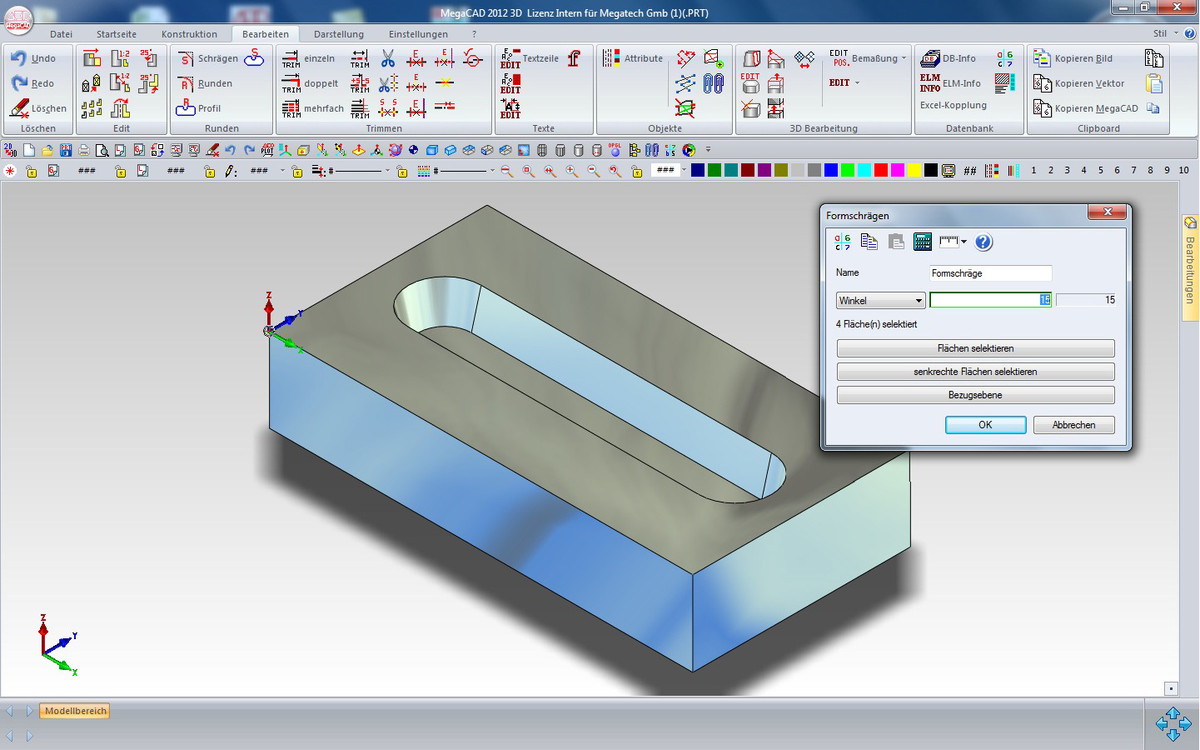 Regelkörper werden direkt, d. h. auch ohne 2D-Skizze, generiert und per Mausklick modifiziert, auch Bohrungen und Rundungen können so ohne Umwege über Menüs geändert werden.