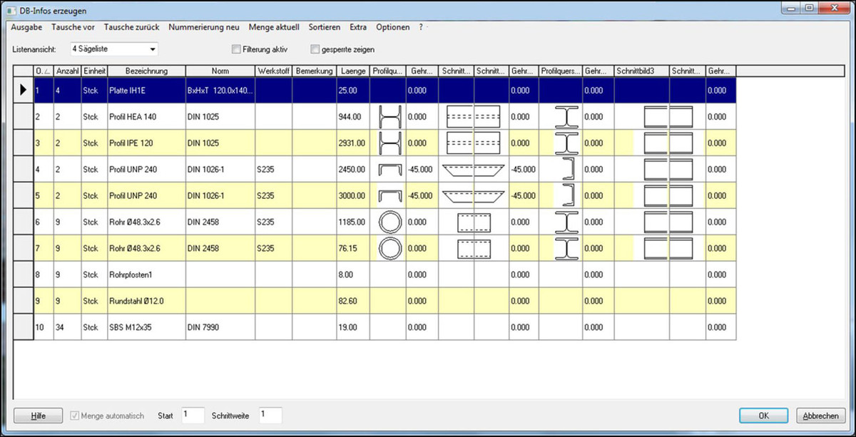 Verschiede Profiltypen (HEA, HEB I etc.) werden im Querschnitt, in der Seitenansicht bzw. in der Draufsicht dargestellt und mit Informationen für die Stückliste versehen. Der Drehwinkel und die Länge werden dabei vorgegeben oder konstruktiv ermittelt.
